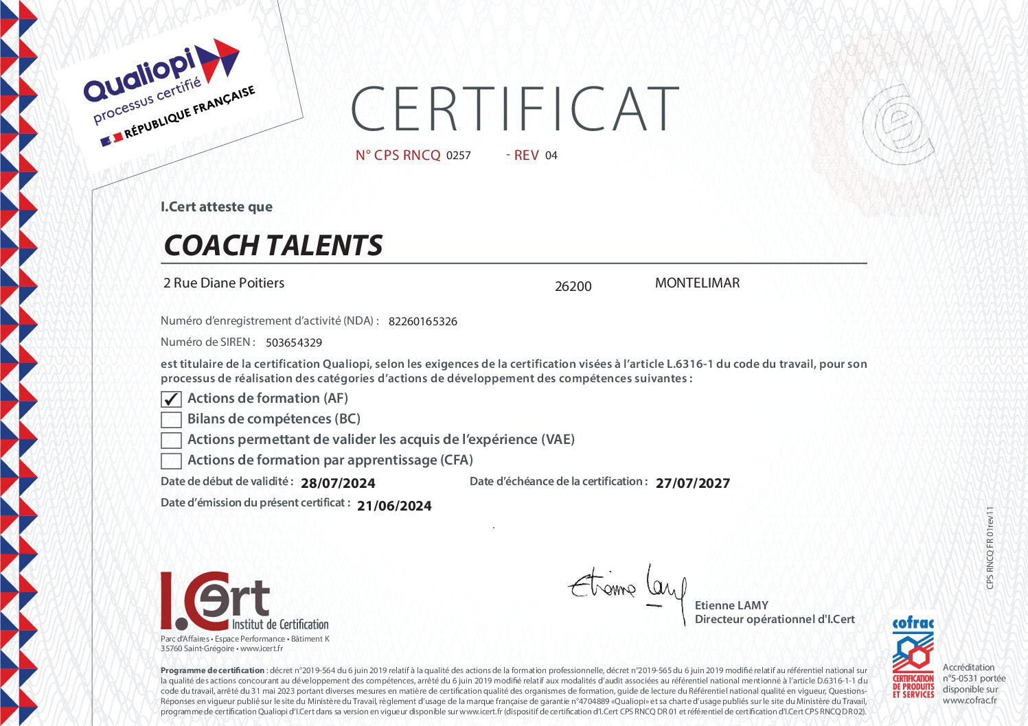CO@CH TALENTS est certifié Qualiopi au titre de la catégorie : Actions de formation.